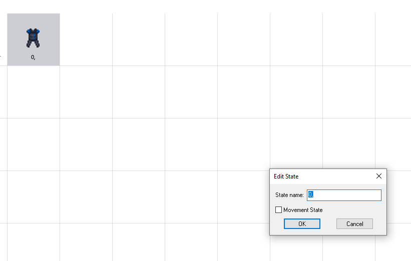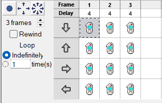 Double-clicking a sprite will open the editor. The editor provides basic, although inefficient tooling to draw sprites. On the bottom, there will be a grid with directionals (top to bottom) and animation frames (left to right), like so.