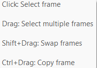 Click to select a frame, Drag to select multiple frames, Shift+Drag to swap frames with each other, and Ctrl+Drag to copy frames.