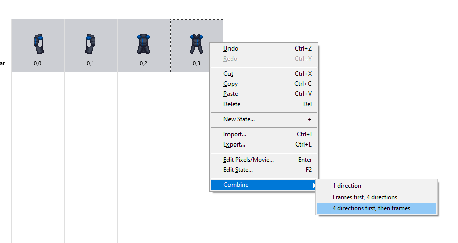 Delete the sprite titled “no name”. It is a combination of all four sprites and will not be used. Drag or Ctrl+Click to select all 4 directionals. Then, right click and choose “combine, 4 directions first”.